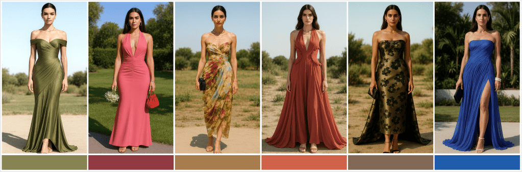 Hemos elegido elegante como código de vestimenta y aquí te sugerimos los colores que irán con la temática de nuestra celebración y condiciones de clima. No tenemos dudas de que te verás increíble con esta selección, eso sí, ten en cuenta que los looks blanco y negro nos los hemos reservado para nosotros.