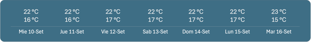 En setiembre ya son días en que se asoma la primavera y el clima está en su mejor momento (entre 16 y 26 °C / 59 y 79 °F).
