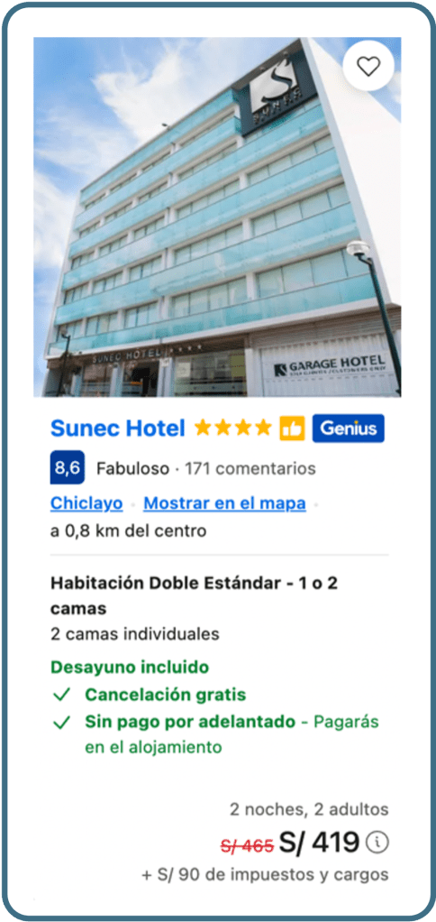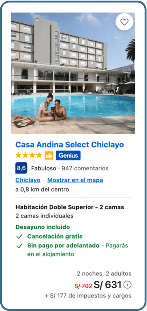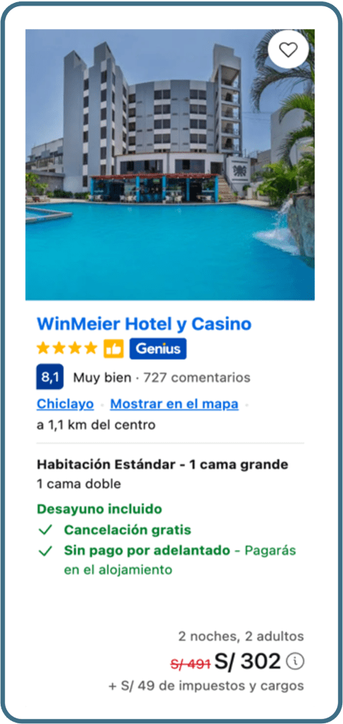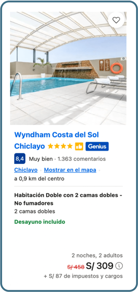 Los precios aquí indicados consideran una habitación de viernes a domingo incluyendo desayuno. Ten en cuenta que son referenciales y varían conforme se acerca la fecha.